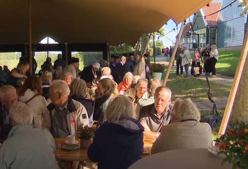 De Schokkerdag werd dit jaar weer eens op Schokland gehouden, op zaterdag 13 september. Het was de derde keer na de oprichting, en ook in 1994 en 2009 was dit de locatie. Opnieuw op de Middelbuurt bij het museum, waar achter het restaurant een grote tent was geplaatst. Zo’n 140 leden en partners hadden aan de oproep voor deze dag gehoor gegeven. Het was dan ook de viering van het 40-jarig bestaan van de vereniging!We werden ontvangen met koffie en Schokker gebak, gepresenteerd door de nieuwe uitbaatster van het restaurant, Shanna Buijsman. Nou nieuw, zij zwaaide hier al jaren namens de vorige uitbater, Dennis Goosen, de scepter (of pollepel?).